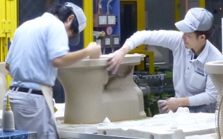 調合した泥漿を型に流し込み、陶器の形を造ります。衛生陶器は形状が大きく複雑なため重力などの影響を受けやすく、部位ごとの収縮率が異なります。手作業で形を整えていく成形技術には、熟練の技が必要とされます。