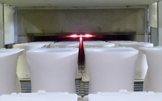 高温のトンネル窯で時間をかけて焼き上げます。製品を一定の間隔で窯内に送り込み、ゆっくりと移動させながら焼成していきます。窯内の温度管理などの操窯作業には、熟練のノウハウが凝縮されています。